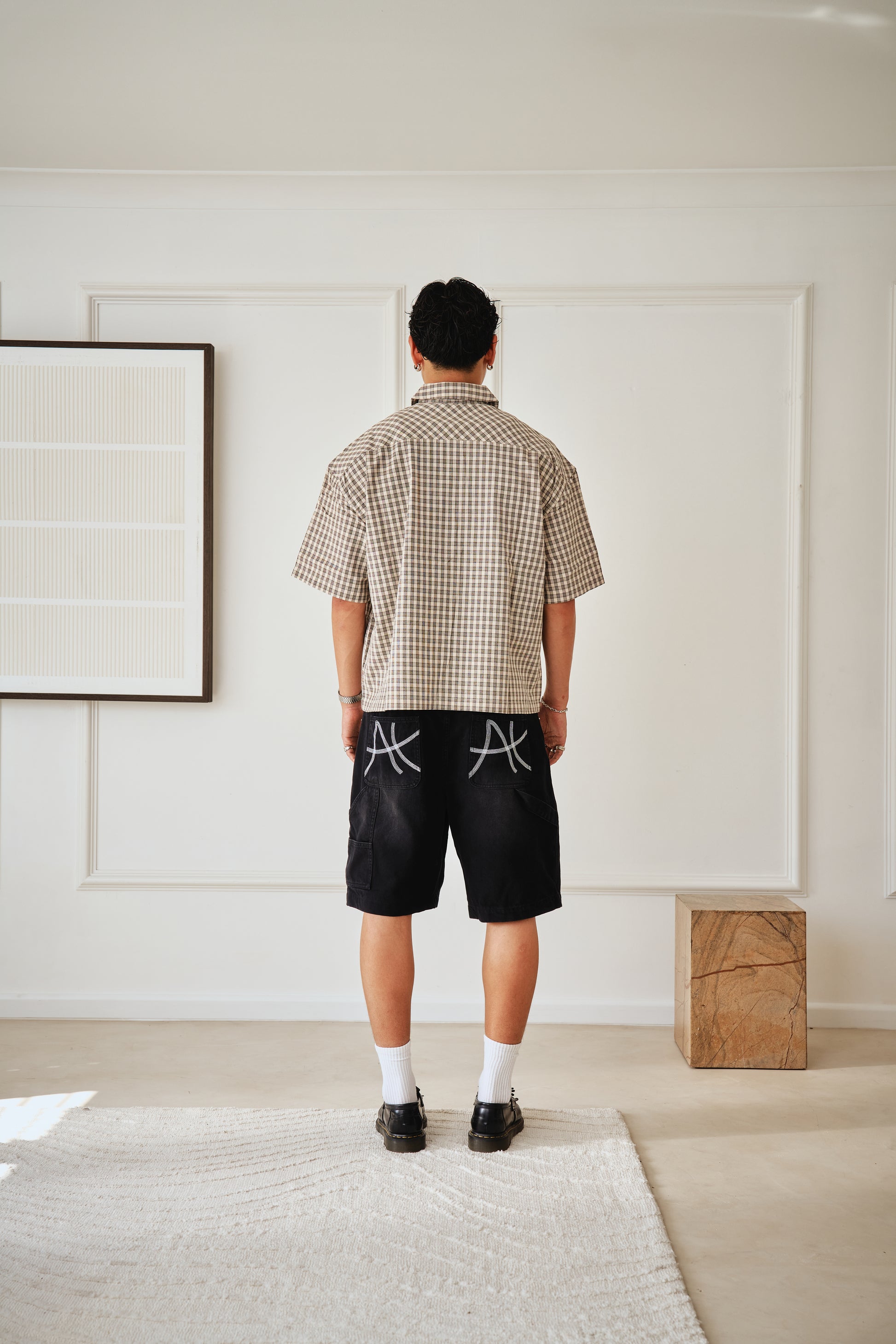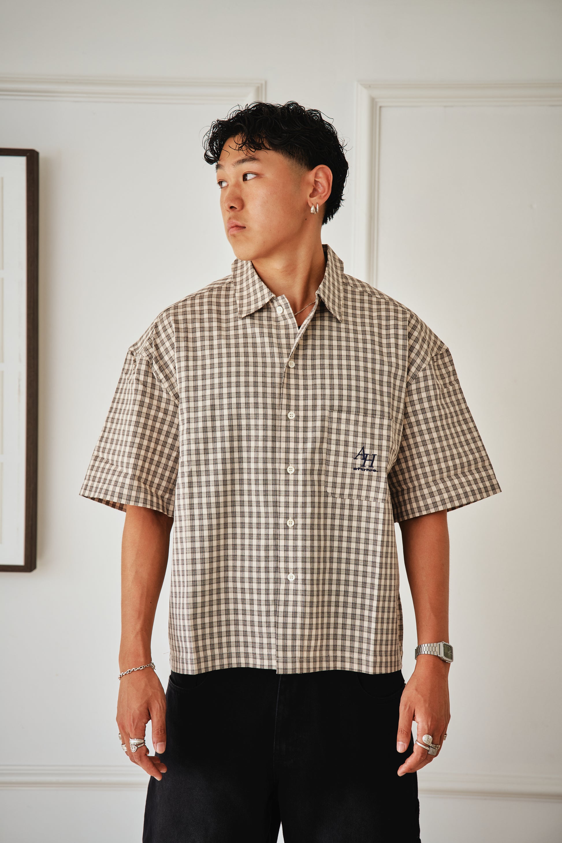 The neutral plaid pattern makes it versatile for layering or wearing solo, while the embroidered AFTRHRS “AH” insignia on the chest pocket adds a subtle signature detail.